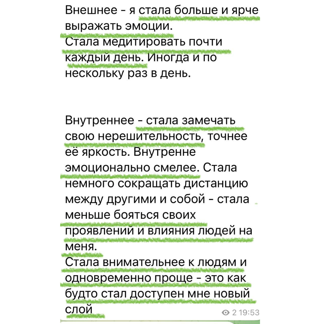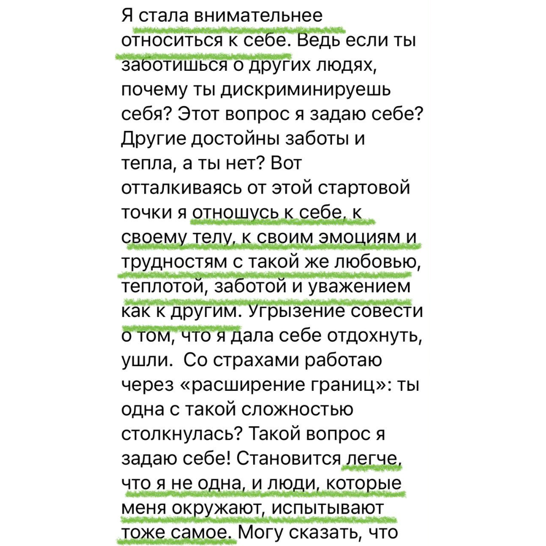 - “Стала правильно относиться к себе, позволять себе отдыхать, больше уделять себе времени”