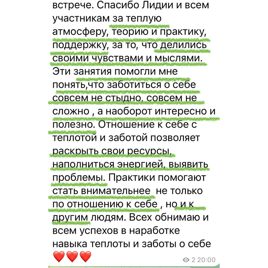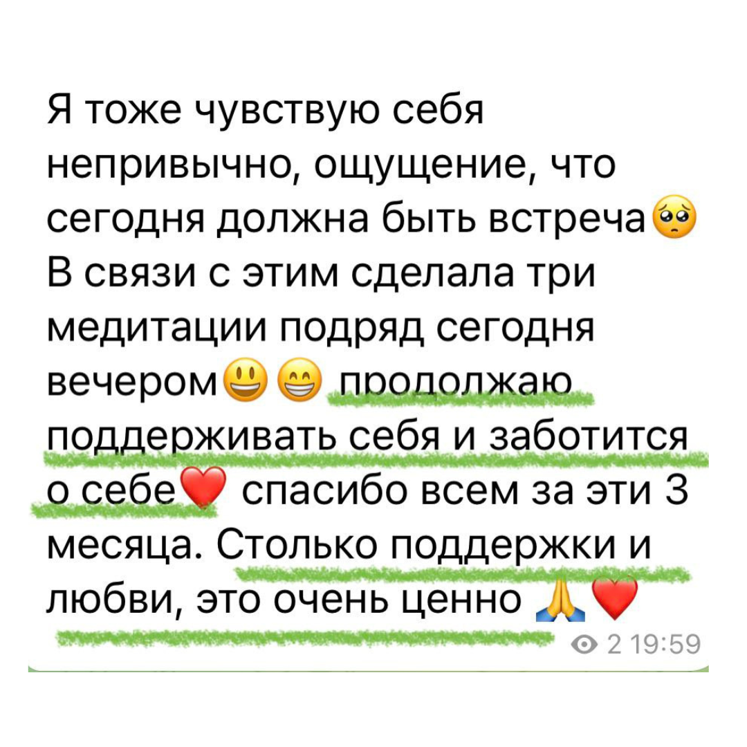 У нас душевно, безопасно, с заботой о себе и поддержкой от остальных участников.